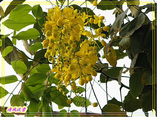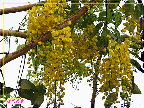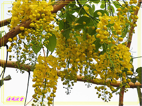 總狀花序腋生,花序下垂10-40公分,先開花而後長葉,花色鮮黃亮麗而明顯。花萼5枚,淡綠色;花瓣5枚,離生,兩側對稱,長約2-3.5公分,花瓣基部縮小成爪狀;雄蕊10枚,花絲黃色,3枚最長約3公分,花絲成圓弧狀彎曲,可孕,供傳粉者停棲、4枚中等,花絲不彎曲,約1公分, 3枚最短,花絲亦不彎曲,約0.5公分,後二者為供傳粉者食用;雌蕊1枚,綠色,較雄蕊略長。