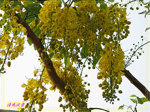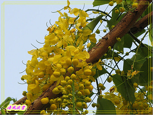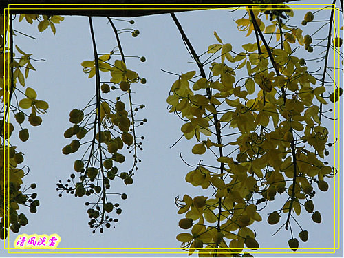 總狀花序腋生,花序下垂10-40公分,先開花而後長葉,花色鮮黃亮麗而明顯。花萼5枚,淡綠色;花瓣5枚,離生,兩側對稱,長約2-3.5公分,花瓣基部縮小成爪狀;雄蕊10枚,花絲黃色,3枚最長約3公分,花絲成圓弧狀彎曲,可孕,供傳粉者停棲、4枚中等,花絲不彎曲,約1公分, 3枚最短,花絲亦不彎曲,約0.5公分,後二者為供傳粉者食用;雌蕊1枚,綠色,較雄蕊略長。
